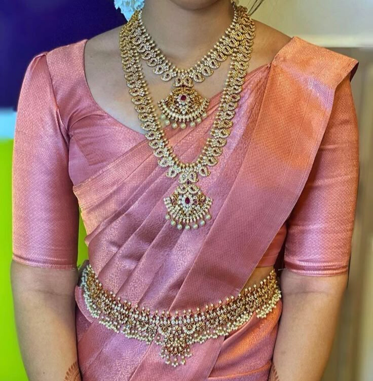 Kanchipuram, Pattu, Gadwal, and Uppada sarees complement these jewels beautifully their rich weaves balance the gold and pearls perfectly.